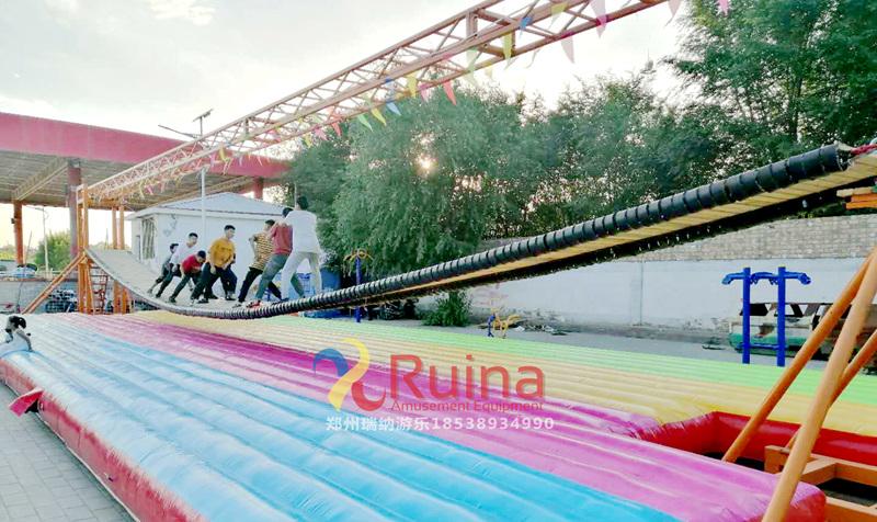 網(wǎng)紅橋自誕生一來(lái)可謂風(fēng)靡全國(guó),成為了當(dāng)下最受歡迎的游玩項(xiàng)目之一。這個(gè)項(xiàng)目最主要的是考驗(yàn)游玩者的平衡能力:兩邊的游玩者進(jìn)行對(duì)抗,使橋搖晃起來(lái),在規(guī)定的時(shí)間內(nèi)看誰(shuí)先落水。這個(gè)游戲既考驗(yàn)了平衡力和技巧,又增強(qiáng)了趣味性,讓游玩的朋友們回味無(wú)窮!